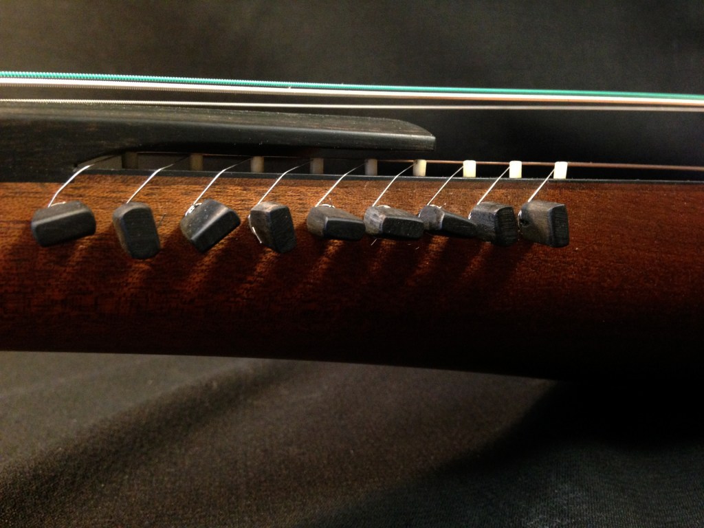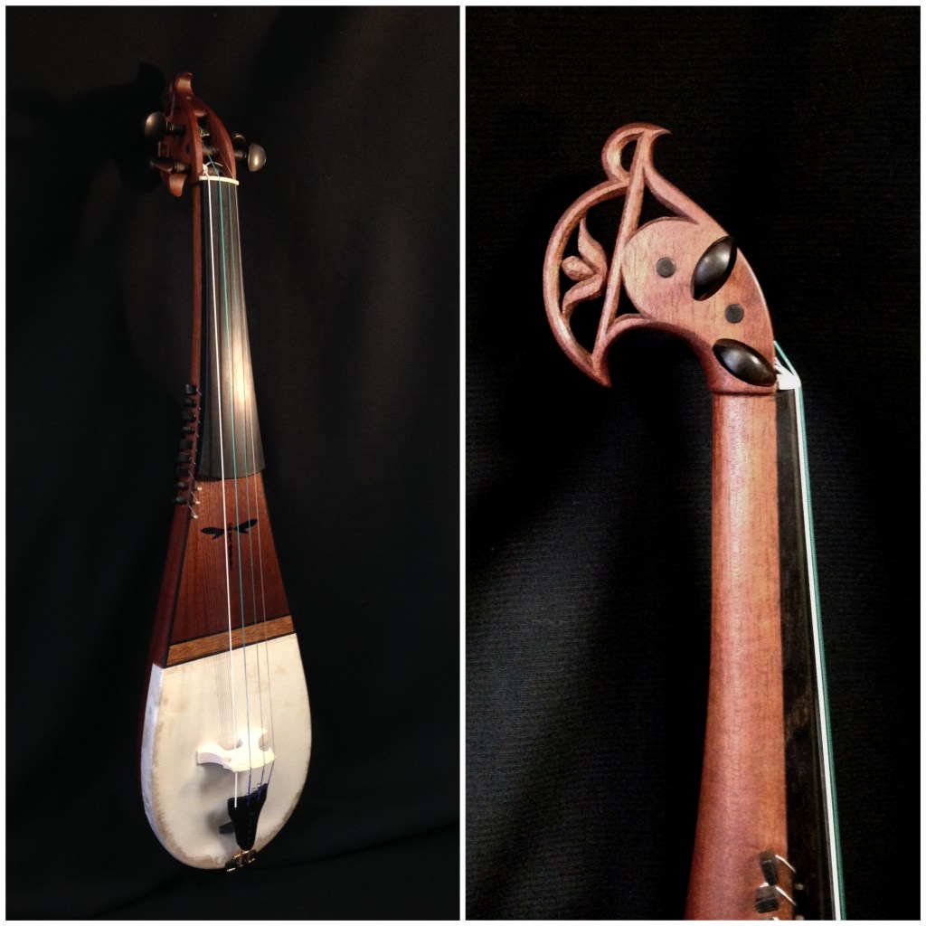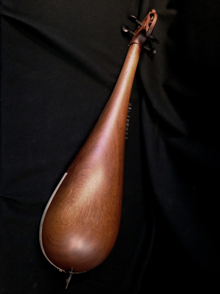 4 cordes mélodiques, 9 cordes sympathiques, structure monoxyle en acajou, table d’harmonie en parchemin, chevilles et touche en ébène.
